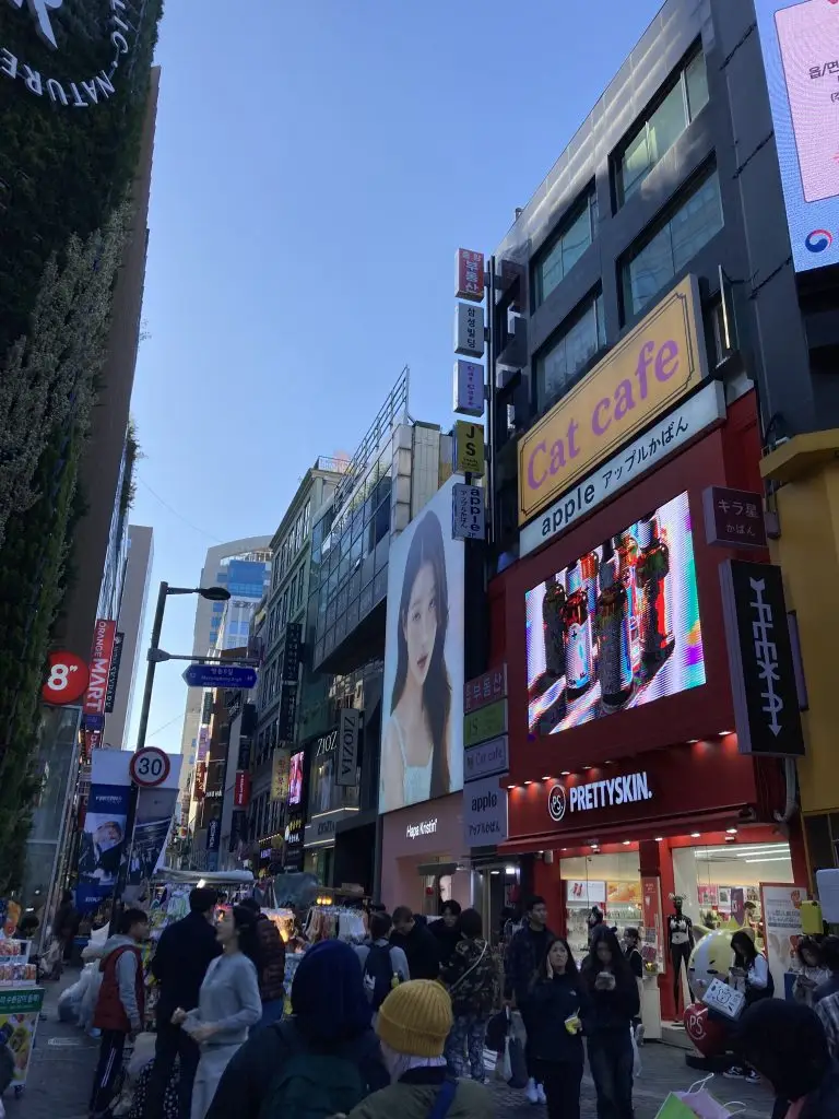 Le lendemain, nous retrouvâmes Anneliese pour aller visiter le palais de Changdeok. Celui-ci était beaucoup moins peuplé par les touristes, beaucoup plus intimiste, mais tout aussi majestueux que Gyeongbokgung. Après avoir déjeuné avec Anneliese, elle partit retrouver des amis à elle, et nous passâmes l’après-midi dans le quartier de Myeongdong. Ces rues étaient remplies d’étals de street-food, et de la K-POP s’échappait de pratiquement toutes les boutiques, lesquelles arboraient aussi généralement des images de divers idols de K-POP en vitrine. Je sentais qu’Élodie n’appréciait pas autant que moi ce brouhaha de dizaines de chansons de K-POP mélangées, mais en ce qui me concerne je reconnaissais toutes les musiques et tous les groupes en vitrine, je passais un très bon moment.